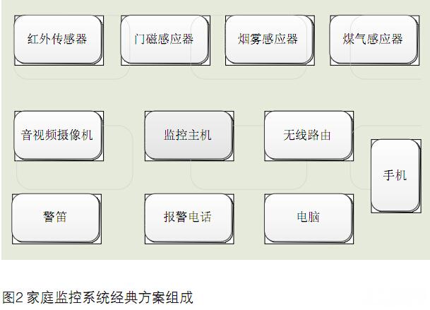 家庭監控體系是一個小型的多傳感器視頻集成監控體系。該體系使用網絡技能將裝置在家內的視頻、音頻、報警器、等監控設備和傳感器連接起來,通過中控電腦或設備的處理將有用信息存儲、傳輸和處理,完成對家庭安全的全方位監控。典型的家庭監控體系構成如下圖所示(見圖2)。