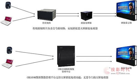 傳統(tǒng)的處理方案是必需要裝備拼接處理器銜接到大屏來完結(jié)這些拼接作用,這種方法構(gòu)成全部體系構(gòu)造非常復(fù)雜不利于運用和保護(hù),并且矩陣到拼接處理器之間也存在不一樣品牌商品的兼容性疑問,一起用戶的建形本錢也比較高。選用圖形圖畫辦理渠道具有有圖畫拼接處理的功用,經(jīng)過渠道的拼接輸出卡直接接入大屏即可完結(jié)圖畫的拼接,窗口,周游和形式的調(diào)用等作用。