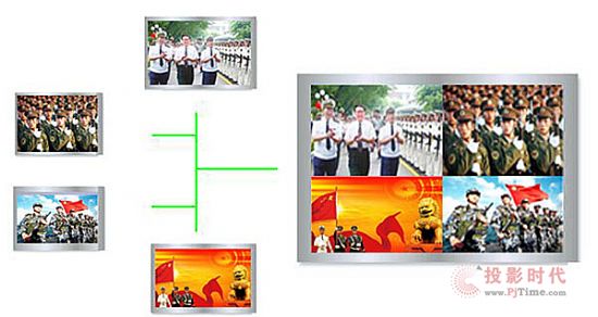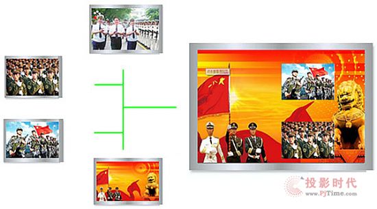 多畫面顯現(xiàn)形式下,不一樣輸入視窗只占據(jù)輸出視窗的一部分,顯現(xiàn)作用如下圖。