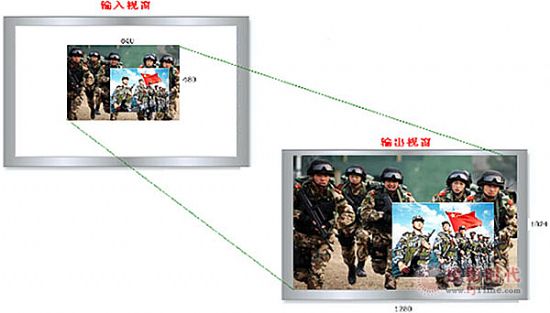 窗口縮放首要是把輸入視窗進(jìn)行等比例擴(kuò)大,如下圖。輸入信號的分辨率為640×480,無法滿屏顯現(xiàn),輸入時信號的分辨率已為1280×1024,已占滿全部窗口。