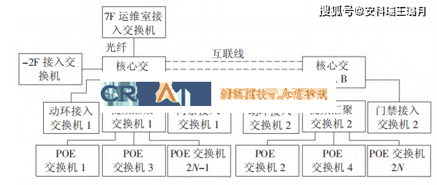 動(dòng)環(huán)監(jiān)控系統(tǒng)硬件設(shè)備的組網(wǎng)要求A、B雙網(wǎng)運(yùn)行設(shè)備逐級(jí)匯接模式,網(wǎng)絡(luò)設(shè)備由POE交換機(jī)、接入交換機(jī)、匯聚交換機(jī)、核心交換機(jī)組成。POE交換機(jī)負(fù)責(zé)視頻攝像機(jī)的供電和數(shù)據(jù)傳輸;接入交換機(jī)使用二層有VLAN功能的交換機(jī),負(fù)責(zé)采集單元中數(shù)據(jù)收斂;匯聚交換機(jī)使用三層交換機(jī),用于匯聚POE交換機(jī)數(shù)據(jù),避免二層網(wǎng)絡(luò)過(guò)大導(dǎo)致環(huán)路,也減輕了核心交換機(jī)的數(shù)據(jù)負(fù)擔(dān)。