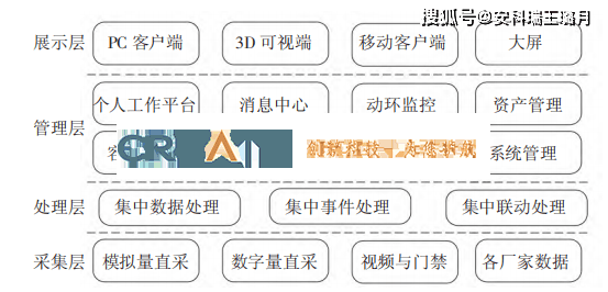 動(dòng)力環(huán)境集中監(jiān)控平臺(tái)軟件采用B/S結(jié)構(gòu),通過(guò)在機(jī)房中安裝各種傳感器及數(shù)據(jù)采集設(shè)備進(jìn)行底層數(shù)據(jù)采集,外廠家設(shè)備需提供通信接口及其開放的通信協(xié)議,進(jìn)行數(shù)據(jù)“翻譯”處理,通過(guò)機(jī)房監(jiān)控平臺(tái)集中監(jiān)控,全中文、圖形化;界面結(jié)構(gòu)層次清晰,實(shí)時(shí)反映數(shù)據(jù)狀態(tài)。集中監(jiān)控平臺(tái)需要能運(yùn) 行于中文Windows操作系統(tǒng)。動(dòng)力環(huán)境集中監(jiān)控平臺(tái)軟件采用模塊化設(shè)計(jì),可劃分為采集層、處理層、管理層及展示層,如圖3所示。其中,個(gè)人工作平臺(tái)能提供動(dòng)環(huán)監(jiān)控主界面、告警事件列表、待辦事項(xiàng)、告警等級(jí)統(tǒng)計(jì)、PUE實(shí)時(shí)曲線、基礎(chǔ)設(shè)施分類餅狀圖等可自由選擇的個(gè)性化定制界面。報(bào)表管理可根據(jù)機(jī)房管理原有報(bào)表格式生成詳細(xì)的數(shù)據(jù)記錄報(bào)表和數(shù)據(jù)分析報(bào)表,存儲(chǔ)格式為Excel或PDF;數(shù)據(jù)存儲(chǔ)時(shí)間需長(zhǎng)于1年,且具有防篡改功能。軟件交互界面中,動(dòng)環(huán)監(jiān)控模塊可直觀看到各個(gè)機(jī)房實(shí)時(shí)運(yùn)行狀態(tài),設(shè)置機(jī)房名稱、設(shè)備圖標(biāo)等超鏈接可直達(dá)各子界面,通過(guò)溫濕度監(jiān)測(cè)、門禁、視頻監(jiān)控、溫度場(chǎng)、漏水監(jiān)測(cè)、紅外監(jiān)測(cè)、消防監(jiān)測(cè)等按鈕可直達(dá)各分畫面,并提供基于電子地圖、實(shí)時(shí)曲線、餅狀圖、折線圖、直方圖等多形式數(shù)據(jù)展現(xiàn)方式,便于運(yùn)維人員分析設(shè)備歷史運(yùn)行趨勢(shì),以判斷設(shè)備狀況。