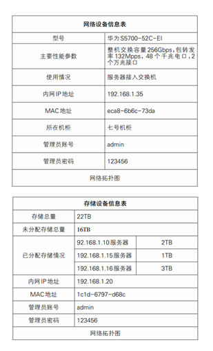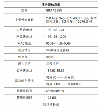 將機房設備按功能劃分為服務器、網絡設備和存儲設備,分別粘貼二維碼標簽,通過掃描即可快速獲取設備基本信息表。其中,“公網IP地址”及“端口映射情況”僅針對公網應用服務器,“管理員賬號”和“管理員密碼”需要特定用戶登錄后才能查看,點擊“所在機柜”可查看機柜布局圖及該設備在機柜中的物理位置,點擊“網絡拓撲圖”可查看整個網絡拓撲圖及該設備在圖中的邏輯位置。